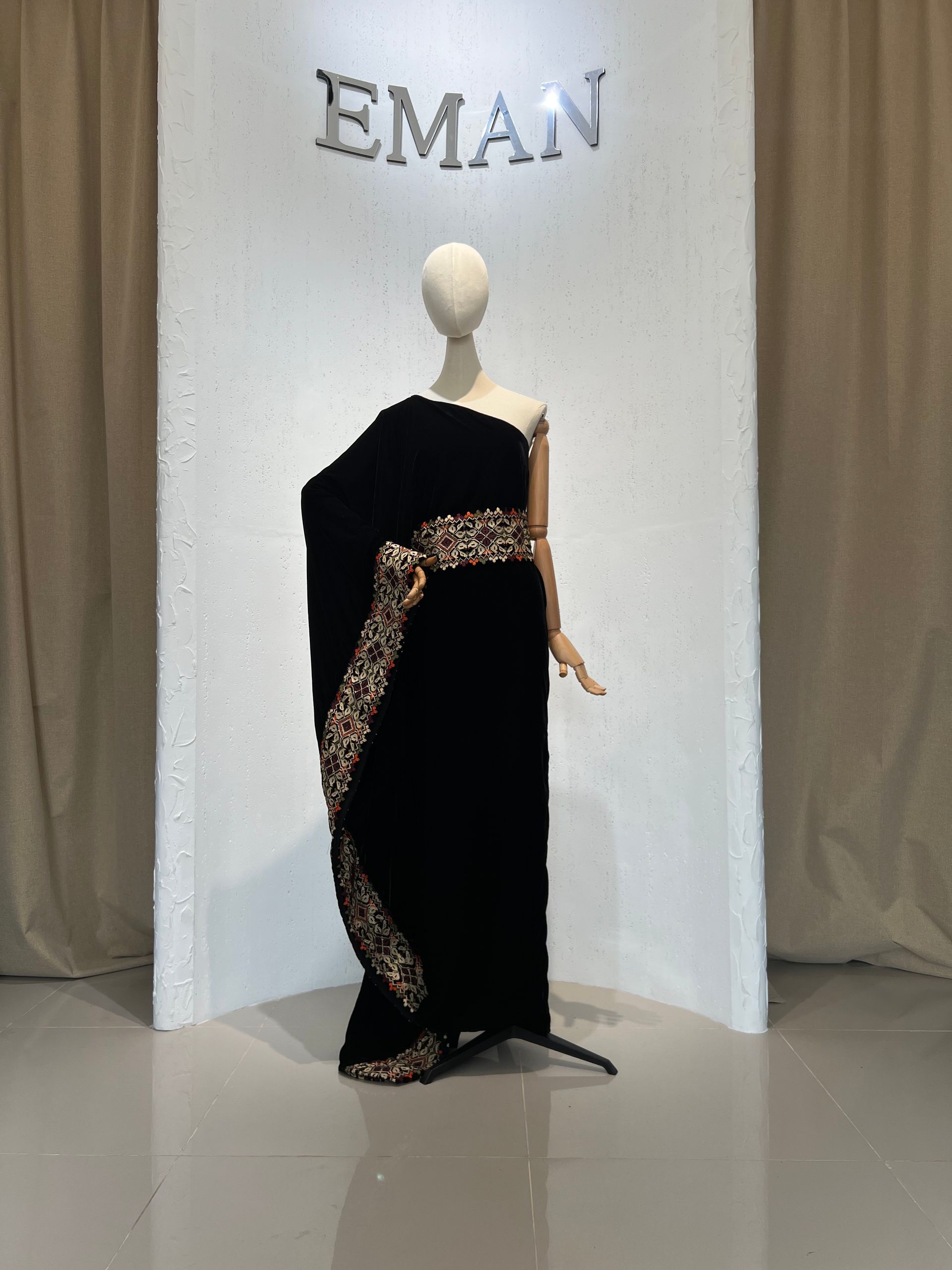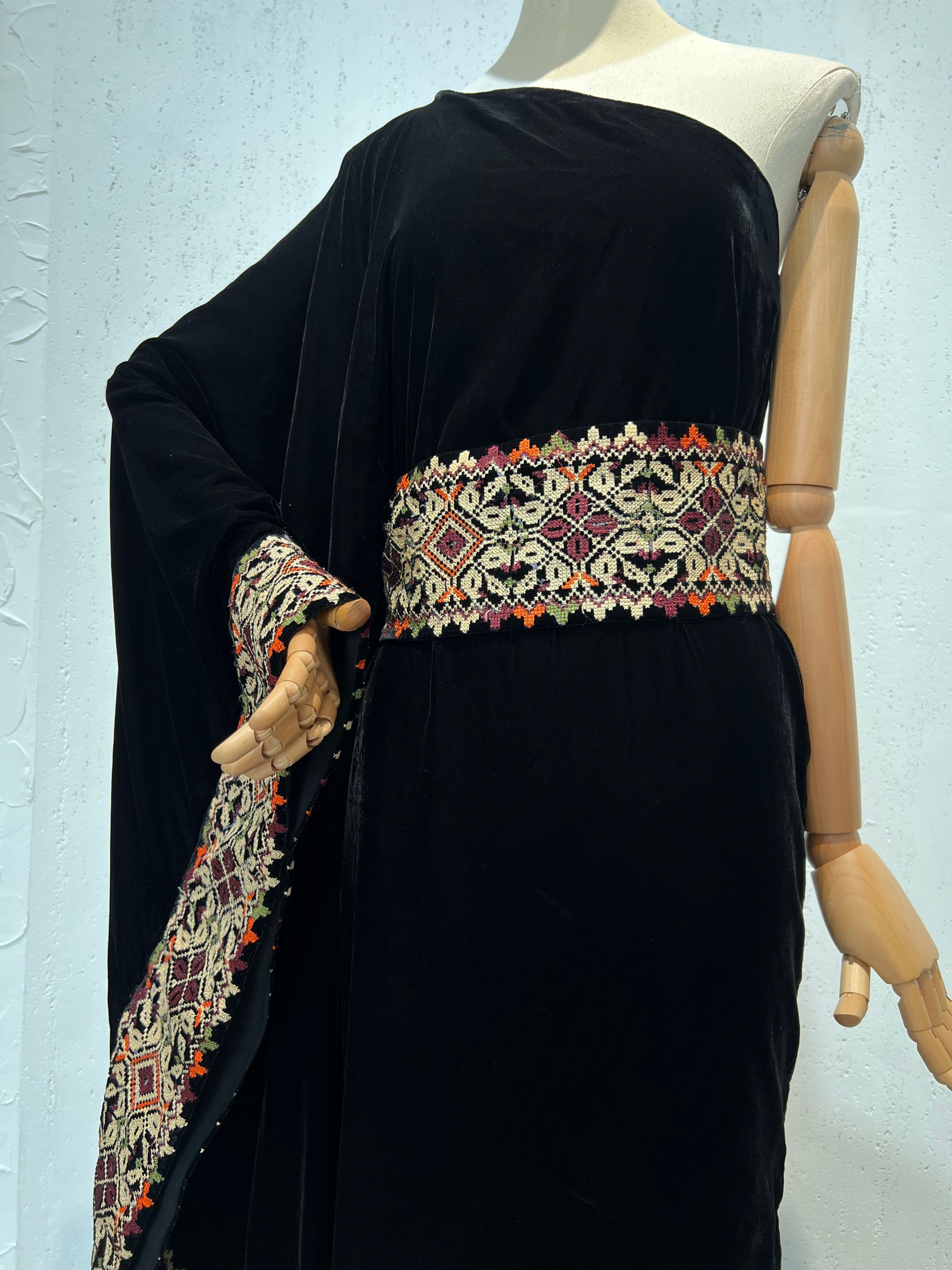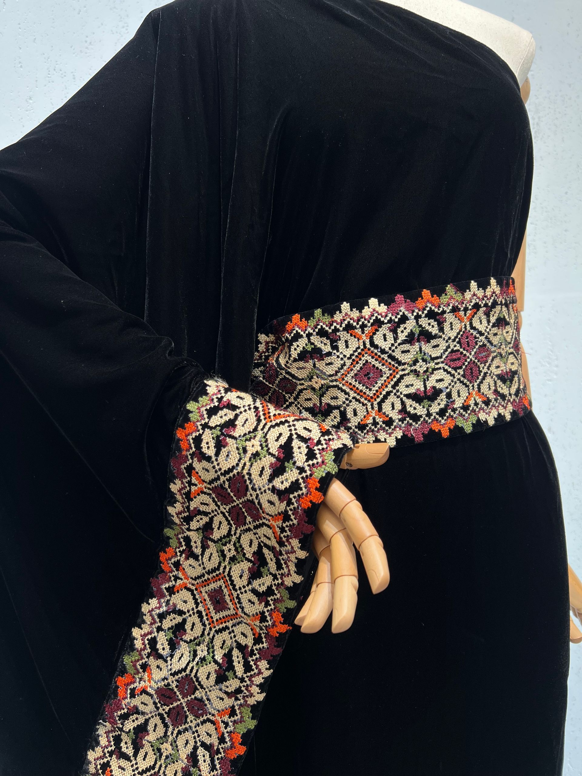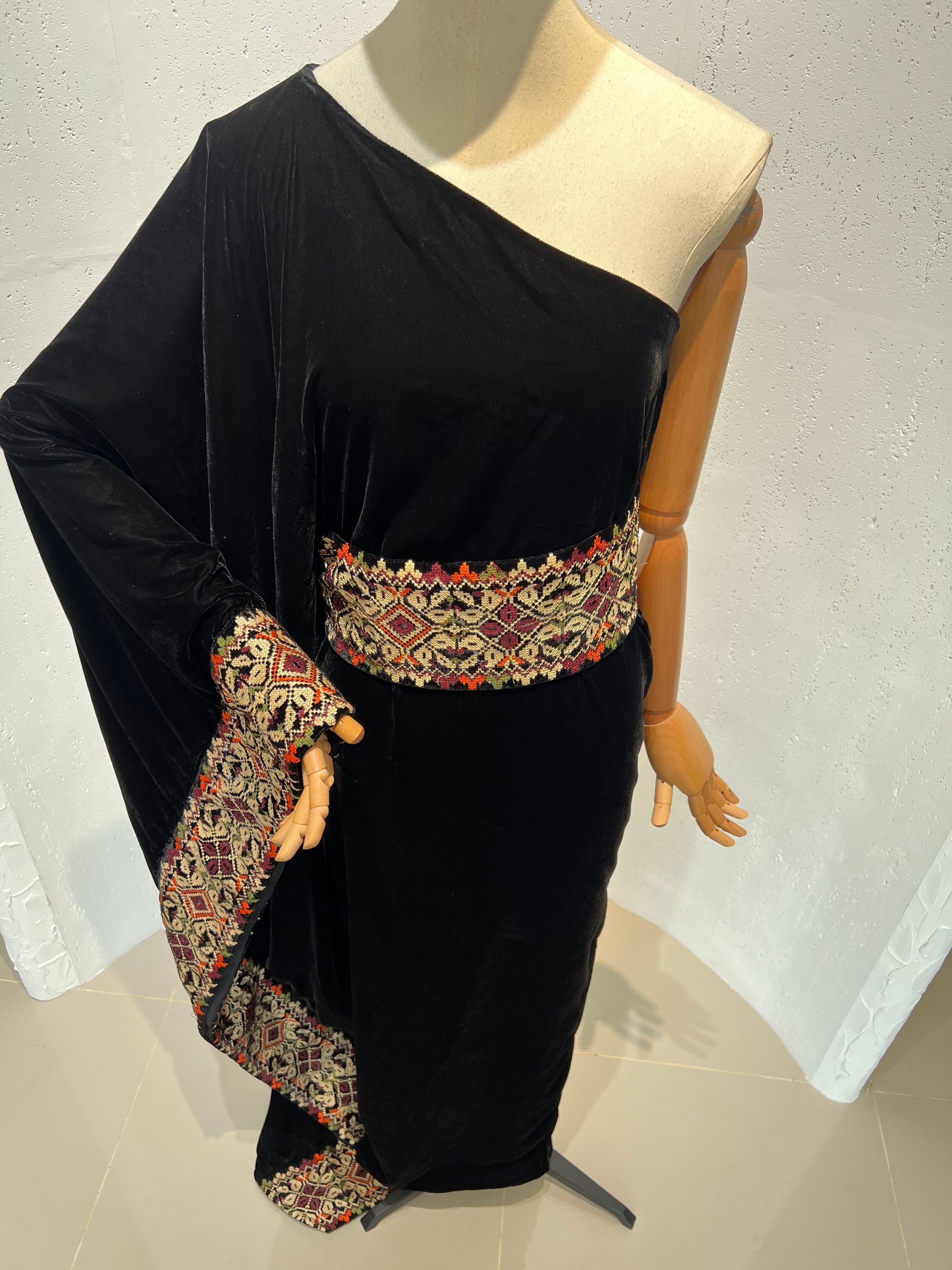 This dress, crafted from velvet fabric, features traditional Palestinian embroidery and was specially designed for a client upon her request.