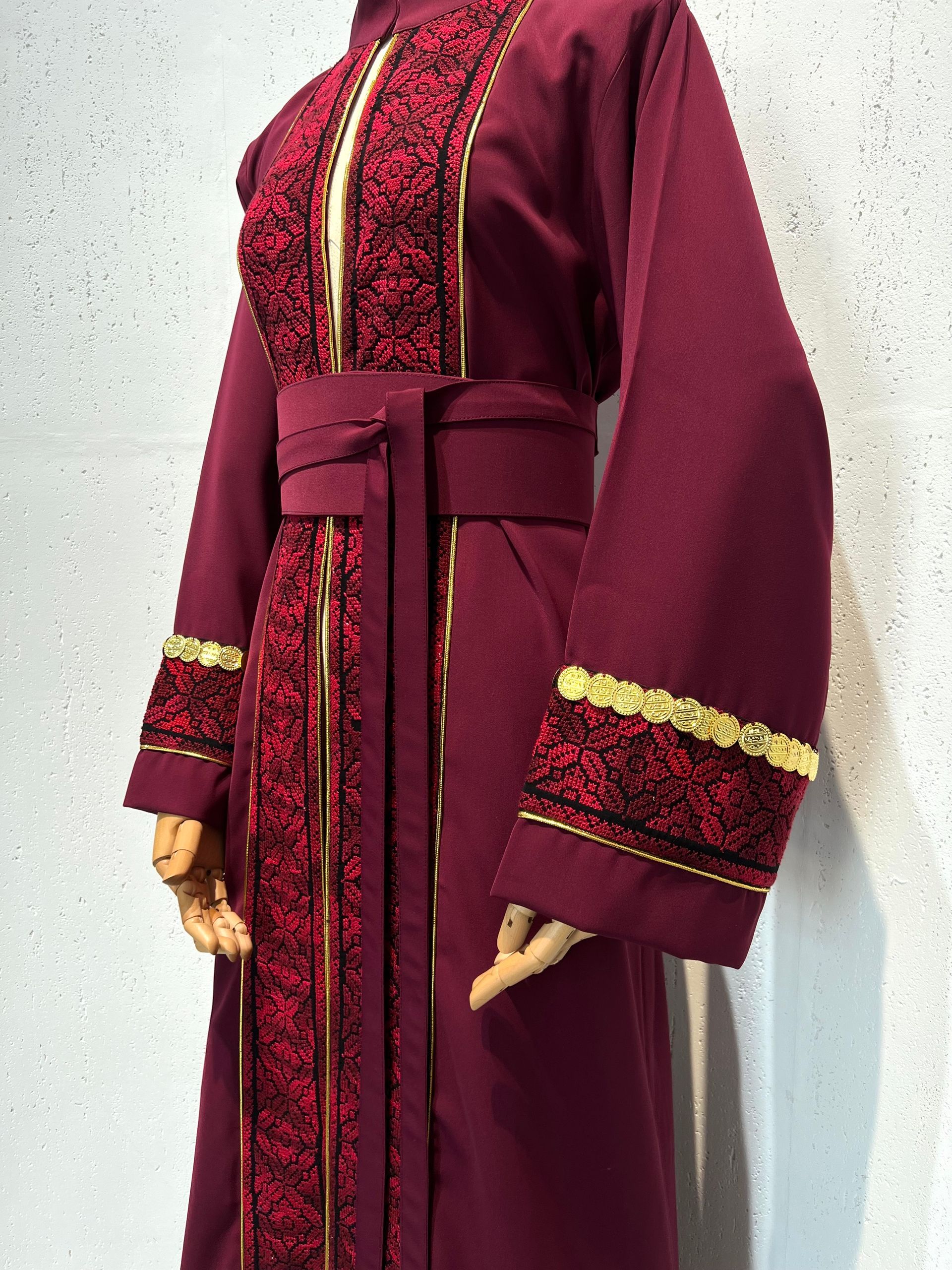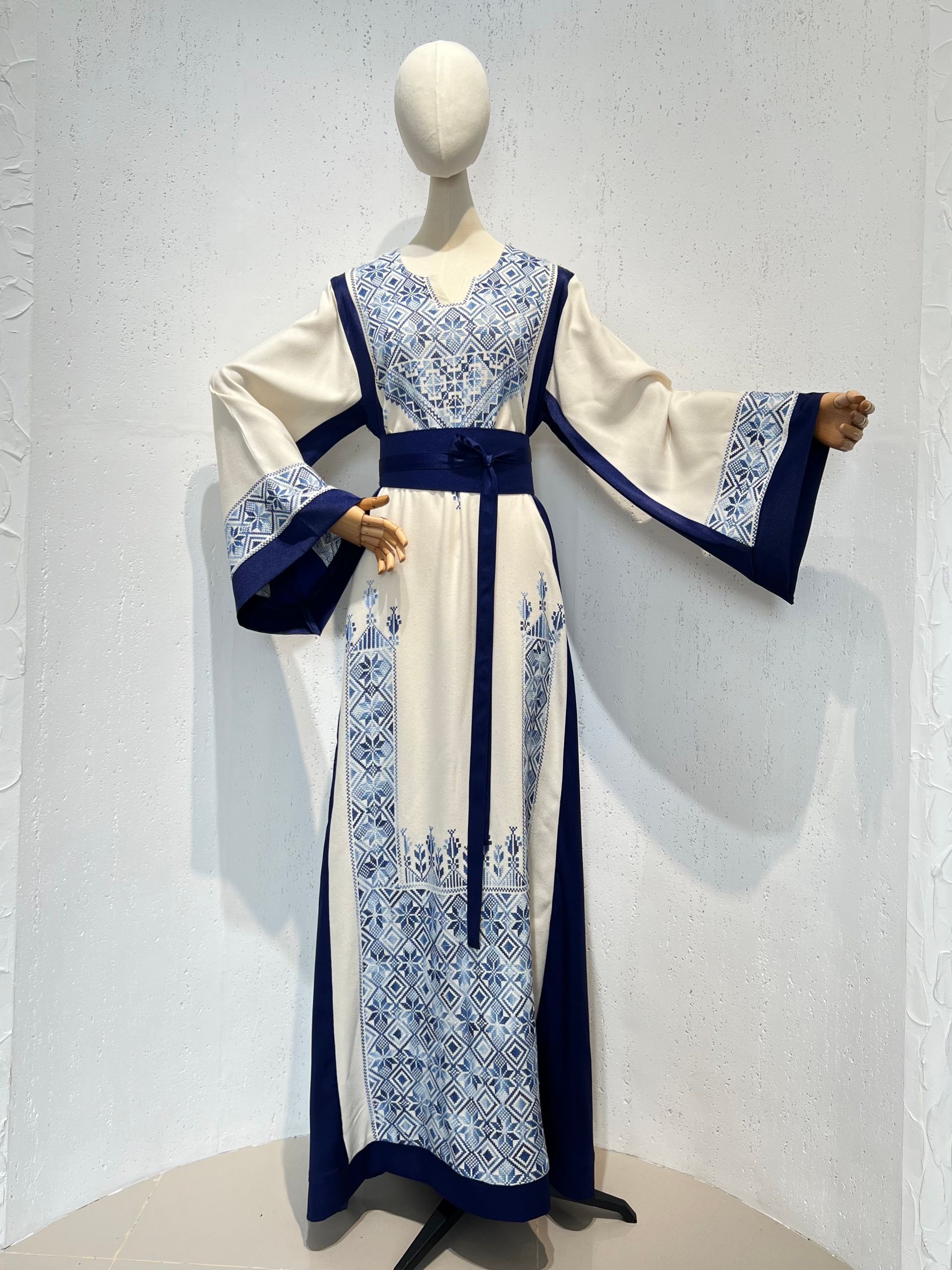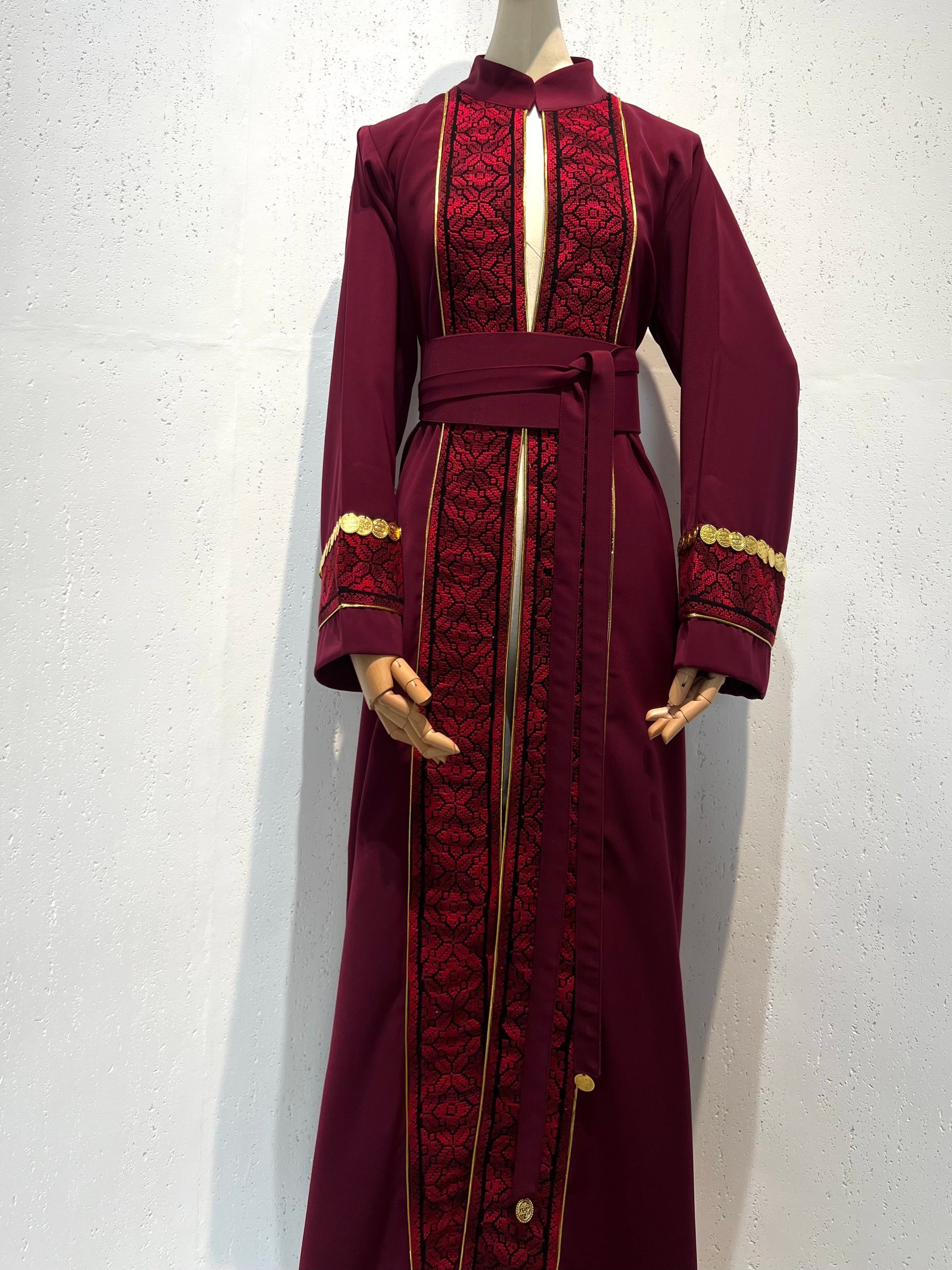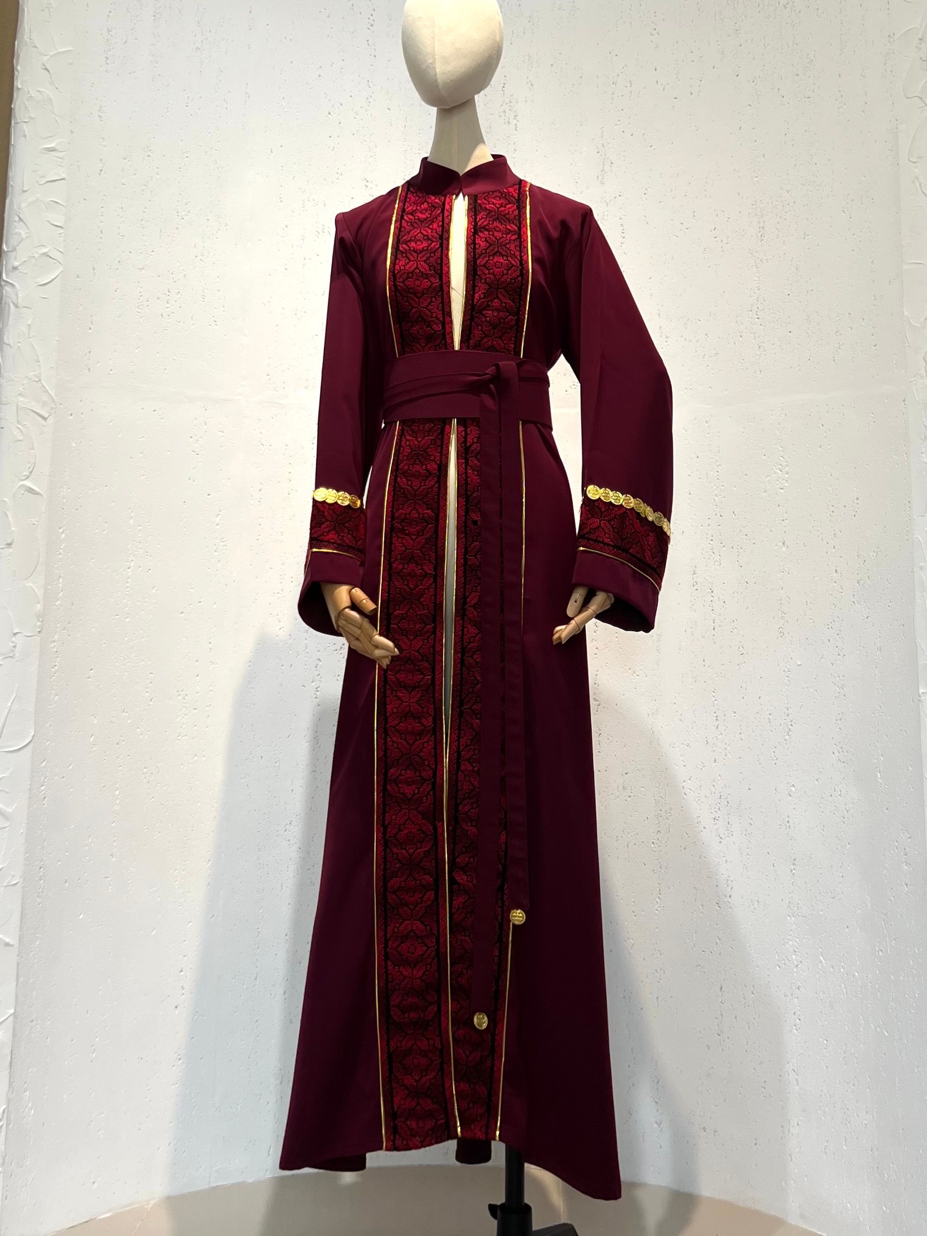 This dress, crafted from velvet fabric, features traditional Palestinian embroidery and was specially designed for a client upon her request.