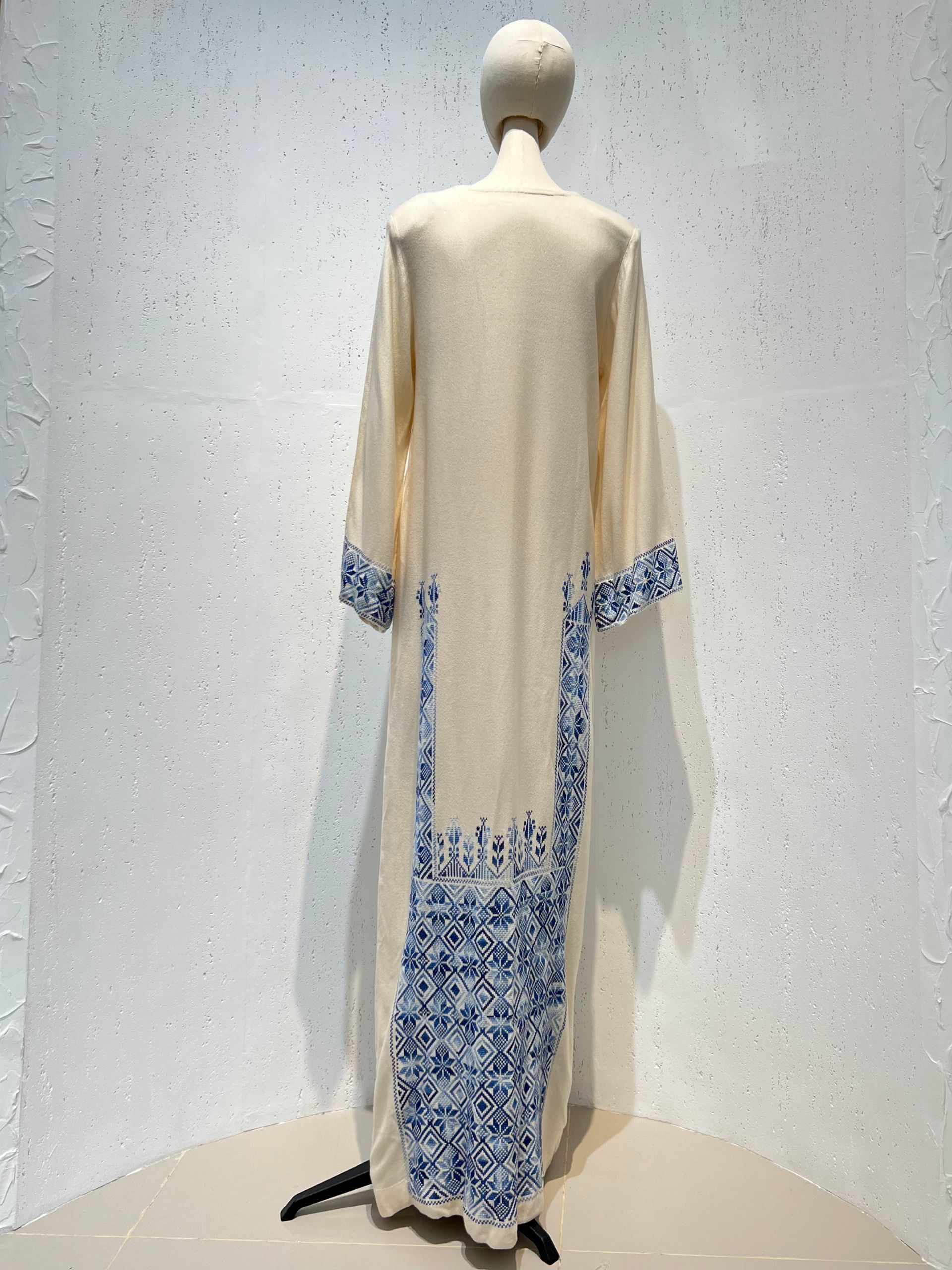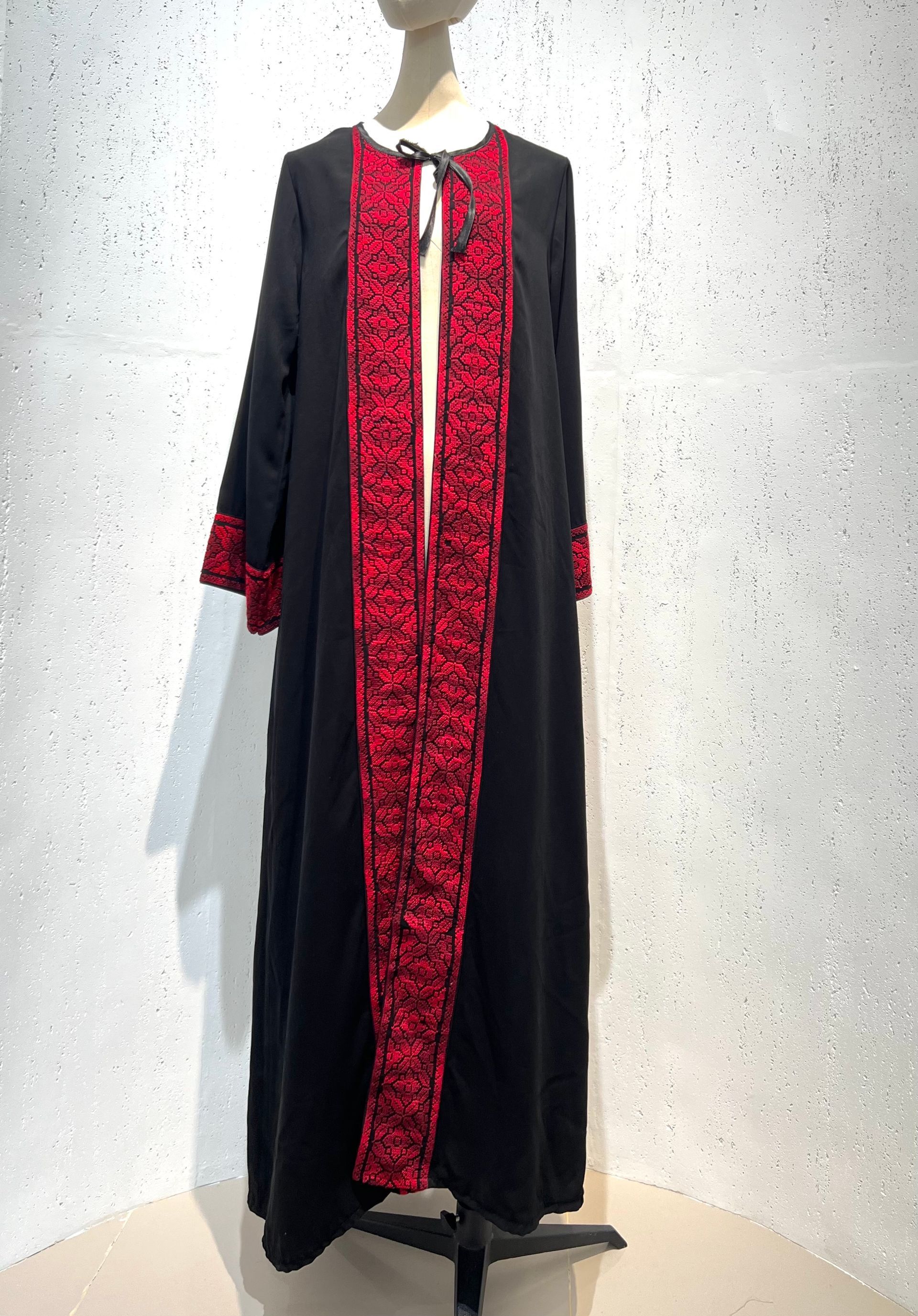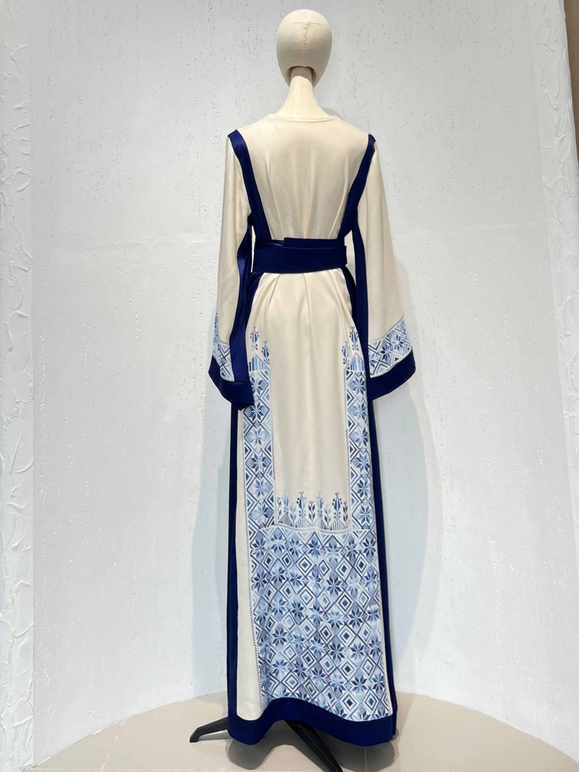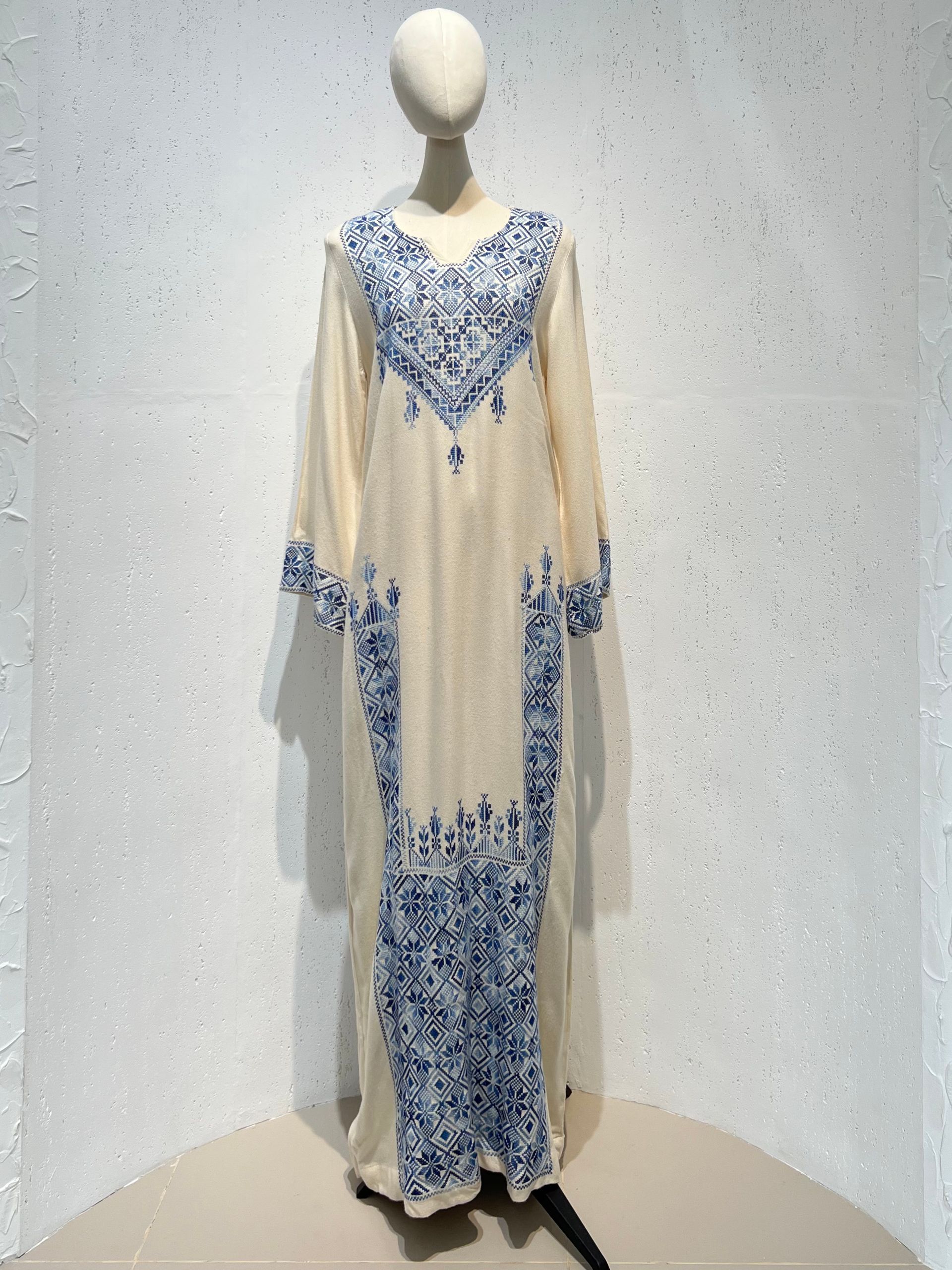 This dress, crafted from velvet fabric, features traditional Palestinian embroidery and was specially designed for a client upon her request.